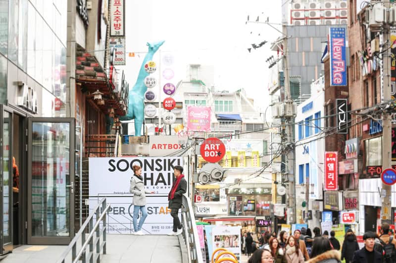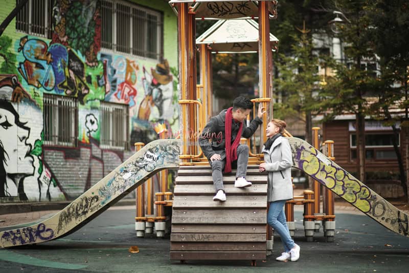 Couple choose Poppy indoor shoot with Hongdae Road scene as outdoor. The couple was very courage as the weather on the shooting day was very cold! Luckily, they prepared a warm casual wear for shooting. Also, during the shooting, groom did prepare a surprise propose ^^
